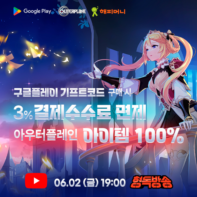 뿐만 아니라 2일 방송 시간부터 6월 8일까지 해피머니홈페이지와 해피머니모바일앱에서는 구글플레이 기프트코드 결제수수료를 면제하여 판매할 예정이다. 결제 수수료 면제와 더불어 해당 기간동안 해피머니에서 구매한 구글플레이 기프트코드를 계정에 충전할 시 권종별 아우터플레인 아이템을 지급받을 수 있으며, 1만 원권부터 20만 원권까지 총 6종에 적용된다.