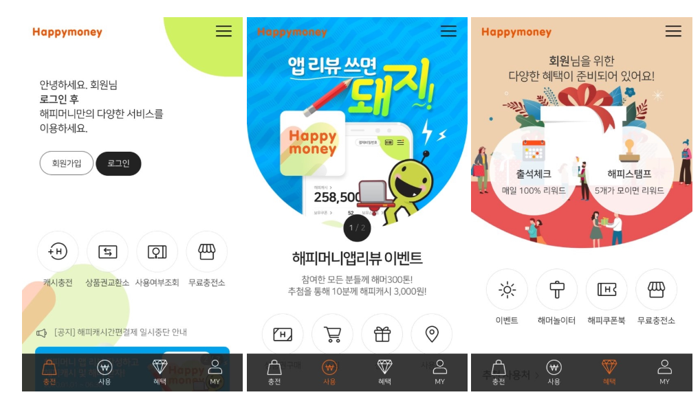 해피머니가 제공하는 여러 서비스를 스마트폰 하나로 해결할 수 있기 때문에 다방면으로 편리하고 유용한 앱입니다.